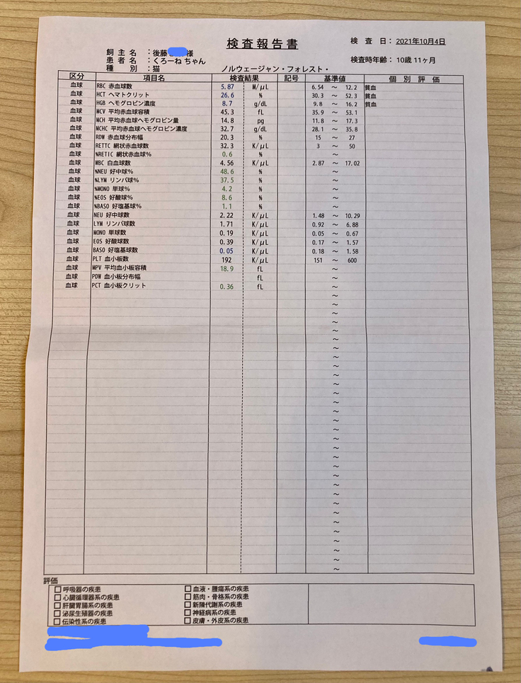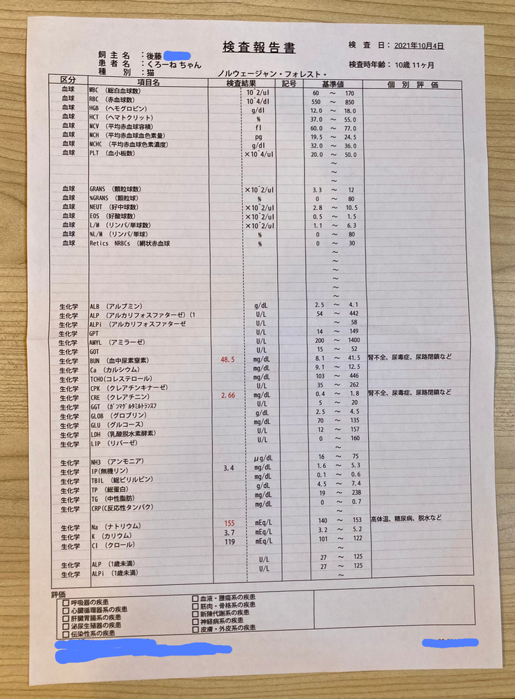 クレアチニン(CRE)=2.66(前回 2.82 正常値 0.8~1.8)