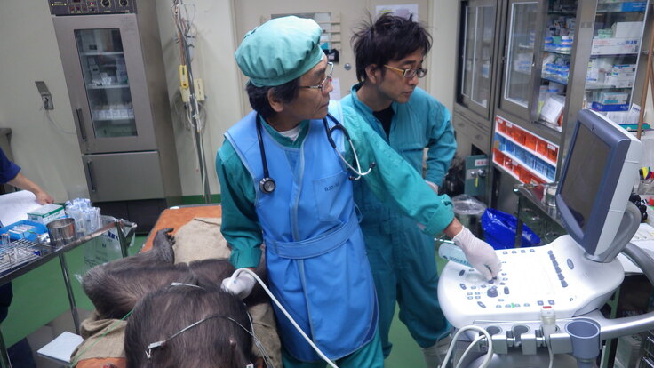 熊本サンクチュアリには日本で唯一のチンパンジー専門病院があります。37年前、私がこの地に赴任して最初に買って欲しいと訴えたのは超音波診断装置でした。体を傷つけることなく内臓の形態や動きを見ることができる革新的な技術で、当時獣医の世界では使われ始めたばかりでした。それ以来、チンパンジーの胎児の発育も、心臓の障害も、子宮や肝臓、腎臓の異常も、数多くのチンパンジーの疾病診断に超音波診断装置を活用し、治療に役立ててきました。県外の動物園への往診で、重い機械を車に積んで運んだことも何度もありました。超音波診断装置が無い病院など考えられません。チンパンジーの健康を守るために、チンパンジー専門病院の獣医療の質を落とさないために、なにとぞご支援をお願い致します。