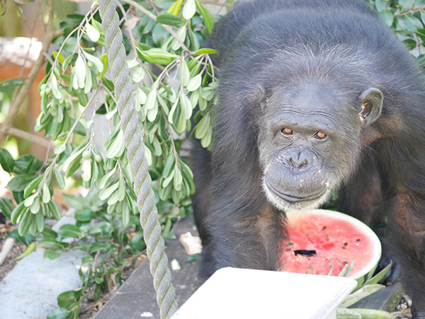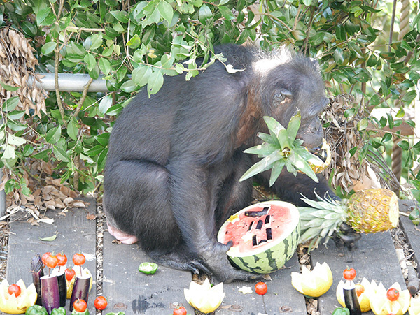 熊本サンクチュアリの誕生会は、果物などでごちそうを用意して、誕生日を迎えたチンパンジーと、その仲間たちで楽しく食べてもらおうという企画です。