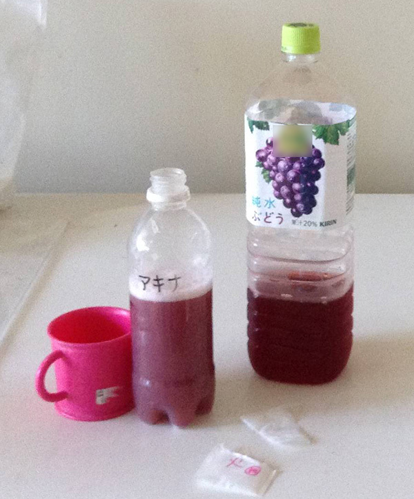 ショウボウの治療の成功の後、7月末に、4にん分の治療薬の購入をして、4にんの治療を始めることにしました。アキナもその対象のひとりです。4にんのなかでは、アキナを最初に投薬対象にしました。アキナをトップバッターにしておけば、もしもアキナが薬を飲まなくても、ほかの3にんの誰かに治療対象個体を切り替えることができます。アキナは、イモ団子に薬を混ぜても食べてくれないことは分かっていたので、ジュースに混ぜる方式を試してみることにしました。