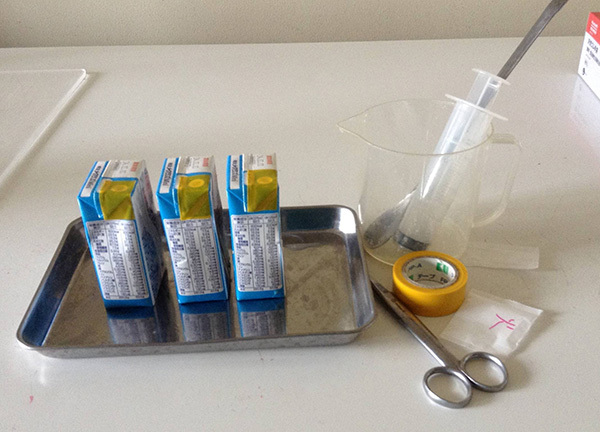 ただし、ひと工夫が必要です。パック入りの飲み物の中身を器に出し、こぼさないように慎重に薬を溶かして、注射器で少しずつパッケージに戻し、テープで穴をふさぎます。そうすることで、あたかも、新品のパックのように装って、アキナにバレないようにしているのです。人間が一度開封したことをアキナに気づかれたら、飲んでくれなくなるでしょう。アキナをだましているわけですが、治療のためなので、許してください。薬入りパック飲料の偽装工作は、神経を使う作業で、30分もかかります。でも、アキナが喜んで飲んでくれるのなら、毎日の30分の苦行も楽しくなるものです。
