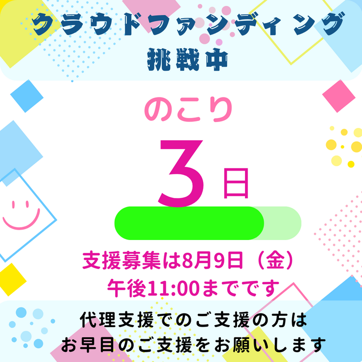 代理支援とはセンターにいったん入金される場合のことを指します。そこからセンターが代理でREADYFORに入金する方法です。これだと入金するのが翌日になったりするので、最終日にはせっかくのお気持ちが間に合わないことも考えられます。センターへ入金くださる場合は、ぜひ8日までにお願い致します。