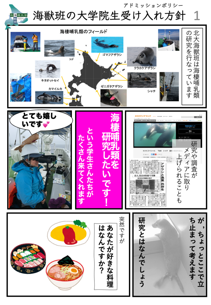 このように私が考えていることを学生と共有できない場合,お互いに不幸な結果になることがあるので,海獣班では,webページ上で受け入れ方針を公開しています(北大の時に作成したものですが,京大異動後でも基本的には同じです).