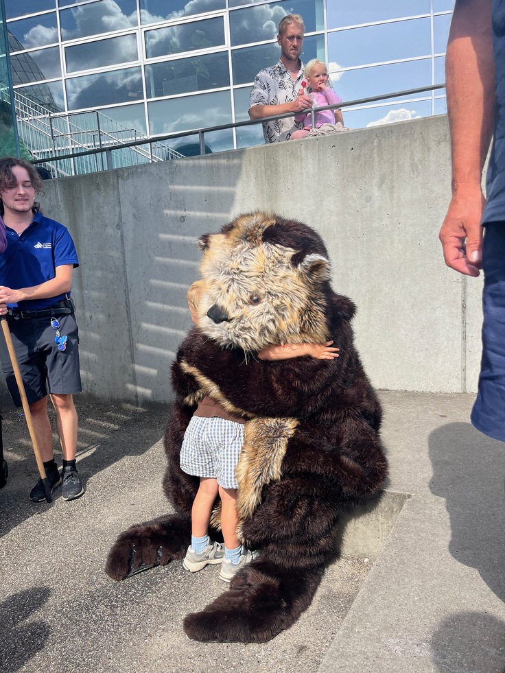 私も水槽前に座っていると、何か、◯ッキーのような高い声がする、と思ったら、でかいラッコの着ぐるみ登場。