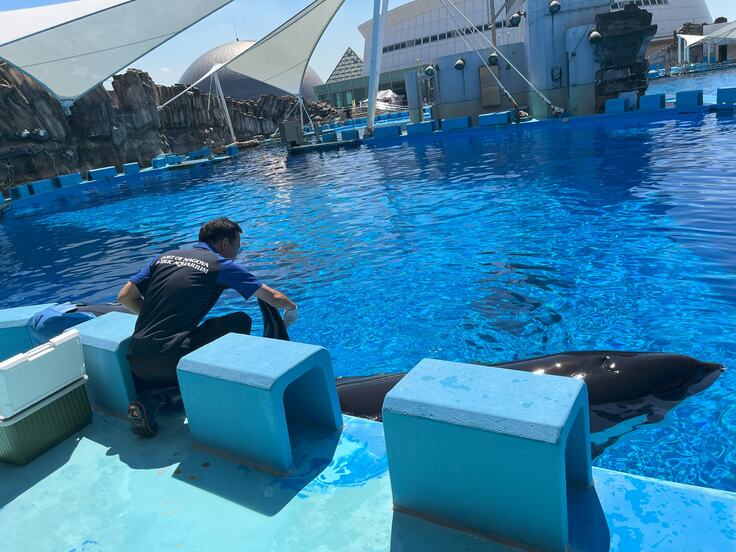 先日,東海大学生物学部海洋生物科学科の北夕紀教授が行う,名古屋港水族館でのシャチの噴気や垢を採取する実験に同行させていただきました.