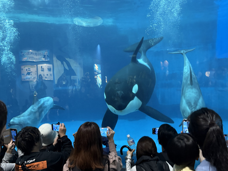 最後に、シャチの水槽に移動して、今水族館の中に飼育されているシャチ「リン」を見に行きました。リンちゃんも元気でいるようで、見ているところまで来てくれました。