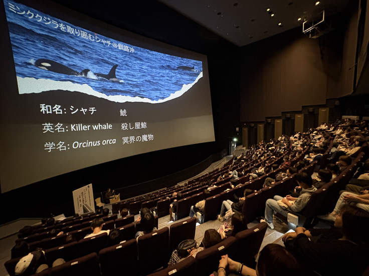 その次、三谷先生の講演が始まりました。昔から今までのシャチと人間とのインタラクション、シャチに関する研究の紹介やこれからの調和についていろいろ解説しました。