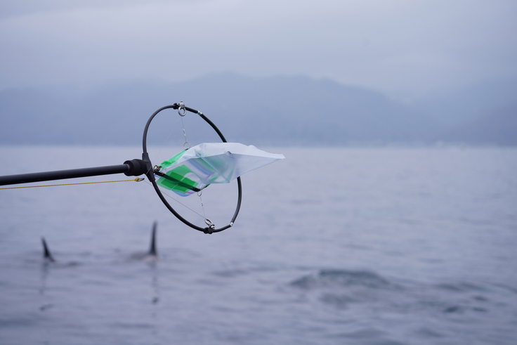 今回の調査でも、シャチの個体識別用写真の撮影、鳴音の録音、ドローンによる空中撮影を行いました。さらに、シャチのDNAを得るために、今まで以上に様々な方法を試すことができました!船上からの噴気(ブロー)採取、バケツでの海水採取、ガーゼ(噴気がかかっているかも?)のほか、新しく、エアーサンプラー(空気中のDNAを得られるかも?)も試しました。