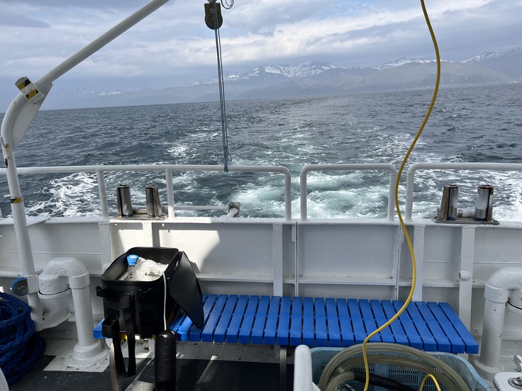 船尾に取り付けたエアーサンプラー(ベンチ上の黒い箱)。DNAをトラップするためのフィルターのようなものを通して、空気を取り入れています。