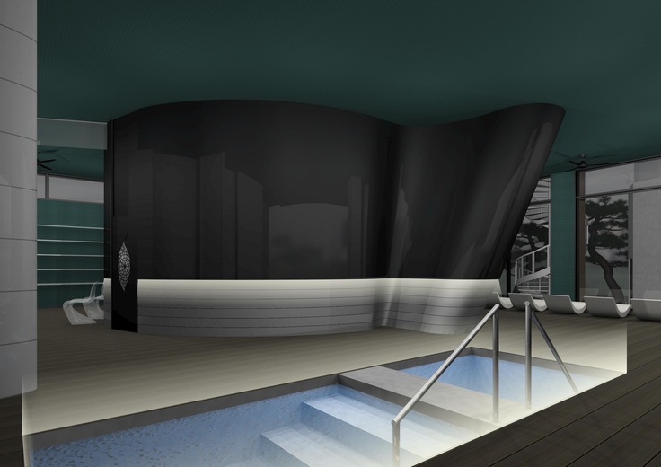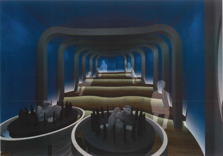 小さな噴水が常に立ち上がる幻想的な空間。30分に一度の「潮吹きタイム」では、噴水の水がストーブにかかりロウリュとなり、さらに風と水がお客様に向かって吹き上がる“鯨の潮吹きショー”を体験できます。