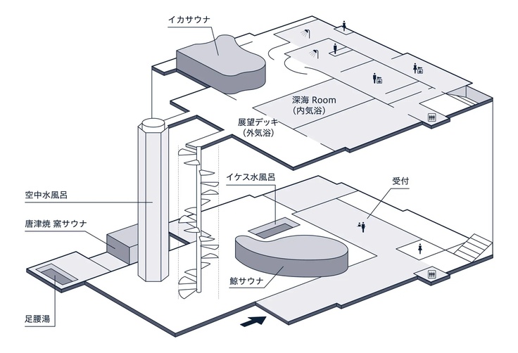 呼子の名物をモチーフにした3種類のサウナ室(鯨サウナ・イカサウナ・窯サウナ)を備えた、ここにしかないサウナ施設です。鯨が深海へ潜り、再び浮上するように、心身を整えることをコンセプトに、海の青を映した幻想的な空間で五感を刺激する新しいサウナ体験を提供します。