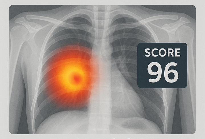 具体的には、撮影されたレントゲン画像をAIがスキャンし、「異常が疑われる領域」について、結節・腫瘤影、浸潤影、気胸といった主要な3つの画像所見を検出します。AIはそれぞれの領域に対して0〜100の確信度スコアを算出し、その数値に応じて色分けされたマーキングを表示します。
