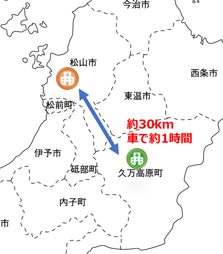 愛媛県立中央病院(三次救急等重症患者用)まで車で約1時間、最寄りの救急病院(一次、二次救急)でも、約40分の距離があります。その他の救急病院は、1時間以上の時間を要します。