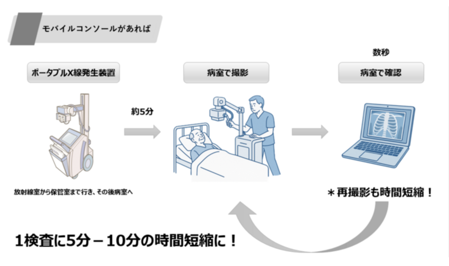 モバイルコンソールがあれば、撮影した画像をその場ですぐに確認でき、再撮影の判断やチューブの位置確認も即座に行えます。患者さんの体への負担を減らし、技師の業務効率も大きく改善されます。