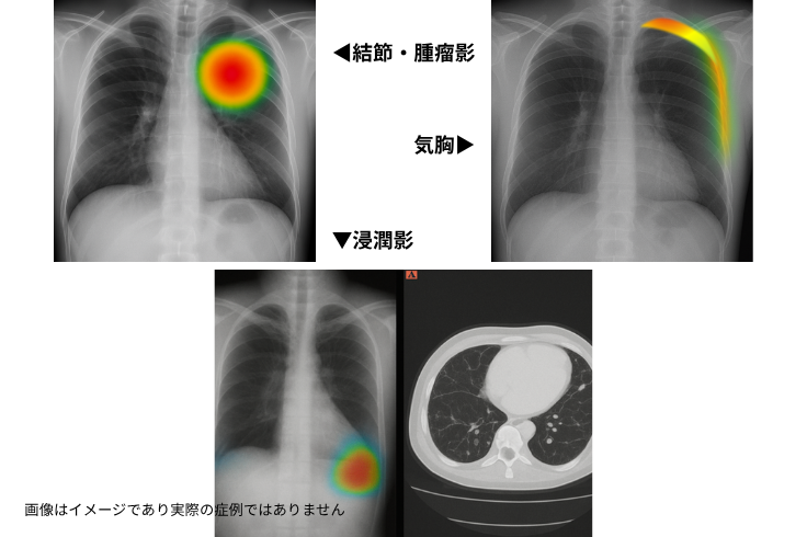 主要な肺疾患の画像所見である結節・腫瘤影、浸潤影、気胸の3所見をそれぞれ検出します。AIからの指摘により、読影者の見逃しを抑え、治療や処置の対応がスムーズになることが期待されます。