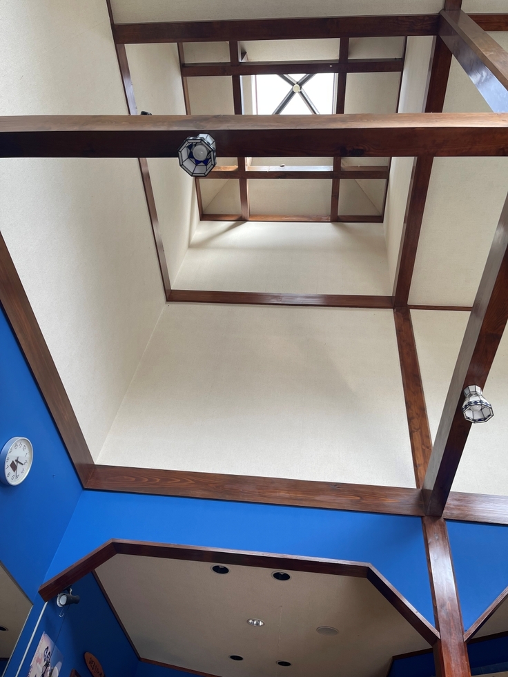 玄関を入ると、高い天井と青い壁が印象的な内装。