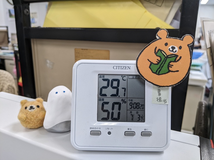 朝9時・すでに事務室には猛暑の気配…(熊本は盆地!夏は厳しく、冬も厳しい土地です…)