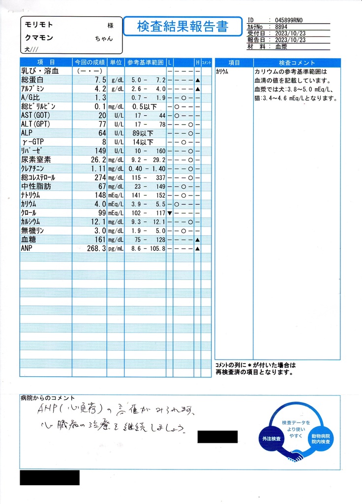 血液検査も心配しておりました腎臓の数値、尿素窒素とクレアチニンは上がっておりました。