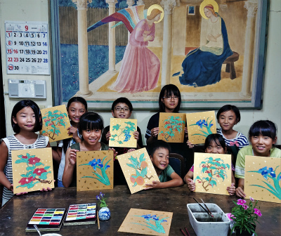 波奈之丸の天井画をお手本に、線描の練習や胡粉での盛上げ、金箔を竹刃で切っての截金など、遊びの要素も多い日本画のプロセスは子どもたちにとっても新鮮な時間になっているようです。