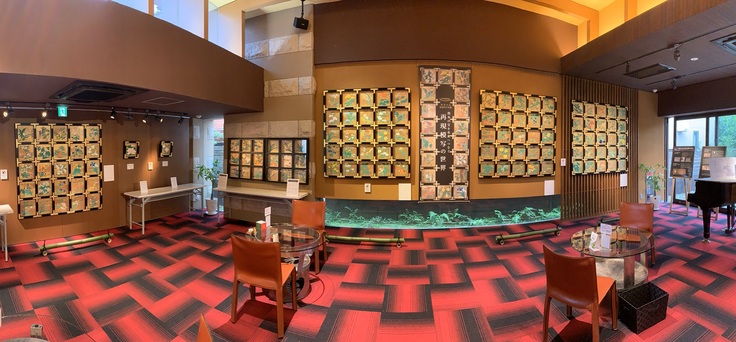 人吉会場は「お菓子の香梅ドゥ・アートスペース人吉店」。赤い絨毯が敷き詰められた床、落ち着いた雰囲気の土壁に球磨川の石を配した空間は、波奈之丸天井画がよく合い、窓から見える庭の草木の風景も心地好い会場です。