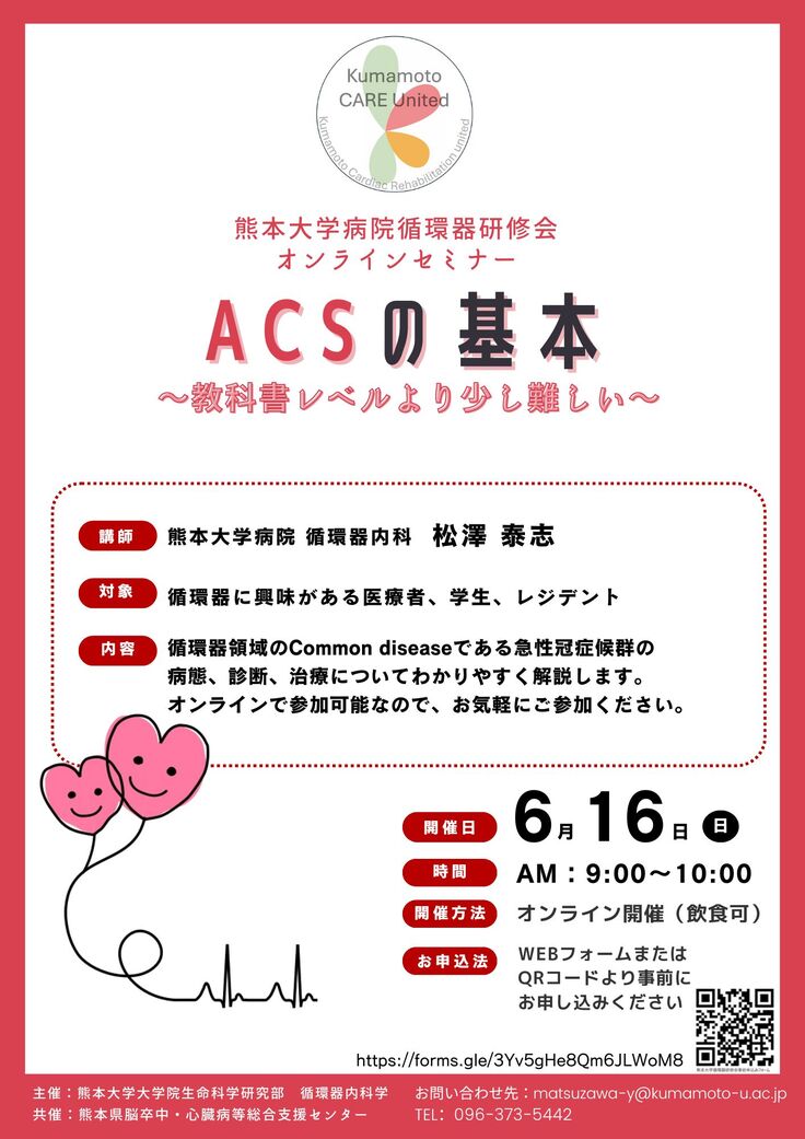 環器領域のCommon diseaseである急性冠症候群の病態、診断、治療について1時間で解説します。日曜の朝ですが、オンラインで気楽に聞いてください。
