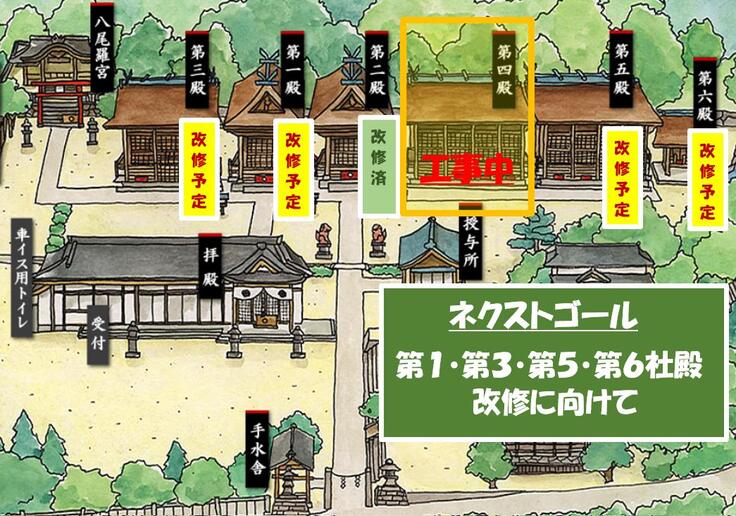 第四殿の改修後に残りの4つの社殿を順次改修する計画です。なお一層のご支援をお願い申し上げます。