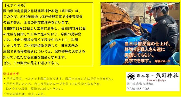 檜皮で屋根を葺く工程を中心として、現場で説明いたします。