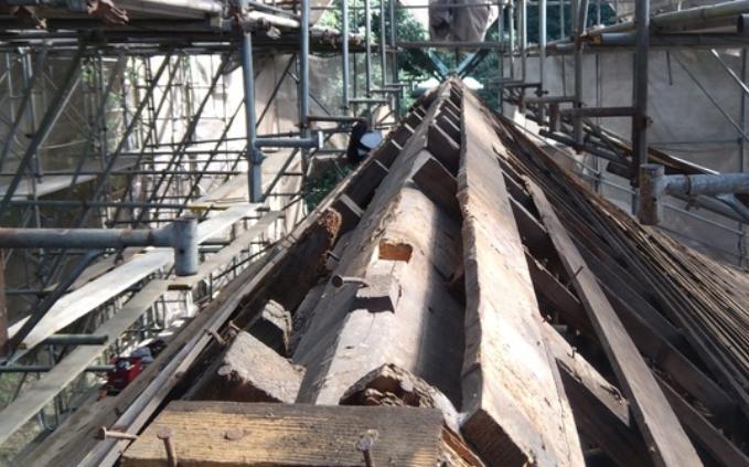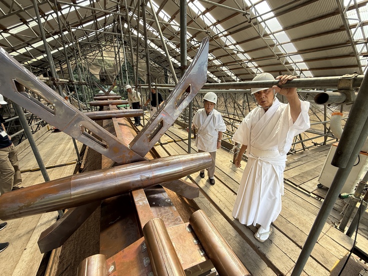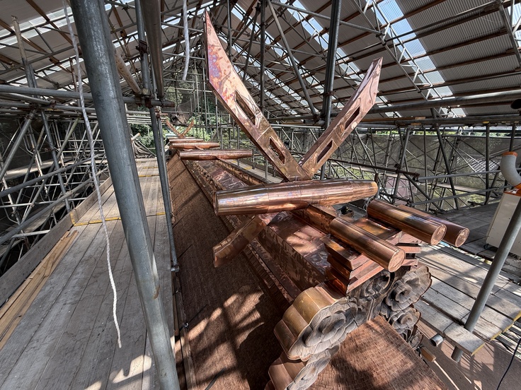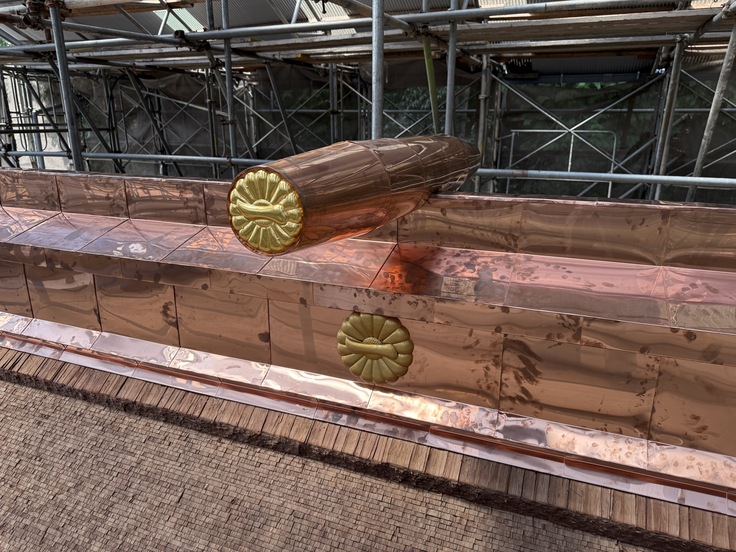第四殿の棟を覆う銅板、銅の千木、銅の鰹木の取り付工事が完了し