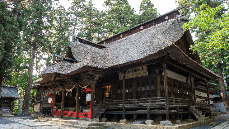 日本三熊野の一つに数えられる熊野大社。荘厳な拝殿は、山形県独自の高い技術が用いられ、県内最古※の茅葺屋根建築として知られています。
