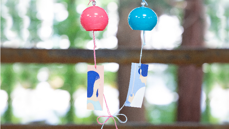 日本では、古来より風のそよぐその音にさえ、想いを託し祈りを捧げてきました。縁結びの神さまと幸せを運ぶ三羽のうさぎのそばで、大切な人との絆を結ぶ二つおそろいの風鈴です。