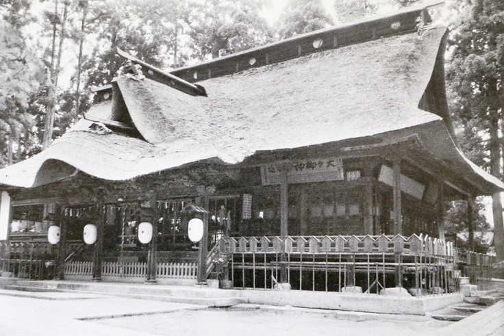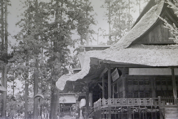 画像は撮影された時代背景がはっきりとしないものの、現在と変わらない茅葺屋根建築の拝殿の様子が分かる貴重な資料です。