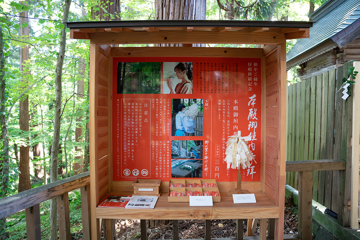 御垣内は、普段は立ち入ることのできない本殿が鎮まるご神域です。拝殿修繕を記念して期間中特別にご参拝いただいています。なお、御垣内参拝は、午前10時から午後4時まで、工事期間中のご参拝を予定しており、工事終了までの期間として10月末までを予定しております。