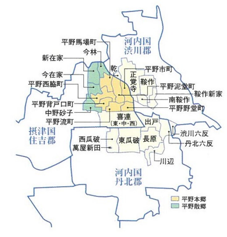 この近世平野郷町を示すため「平野郷」という呼称を使うようにしていますが、当社や当地の歴史について記述する場合の「平野」についても原則はこのエリアを指すとお考え下さい。