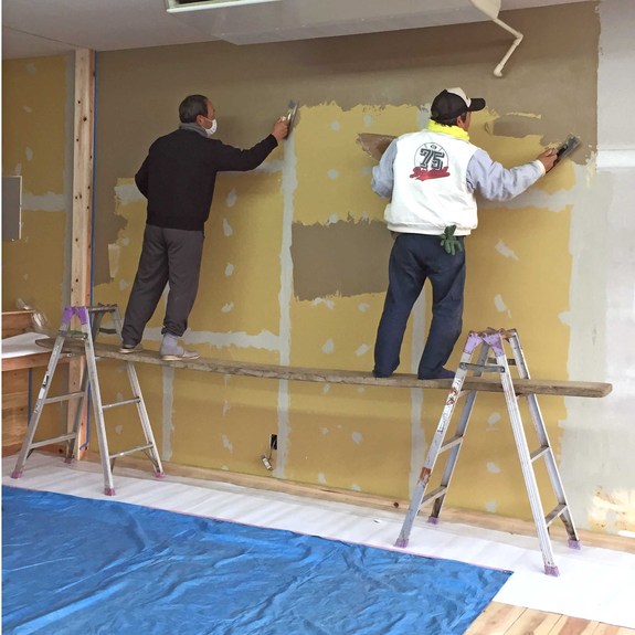 塗り作業にはたくさんの方に来ていただいて、みんなで仕上げた空間です。かなりの面積はありましたが、次第に手馴れた様子でどんどん進み、有機農家さんたちの器用さには関心しきり!