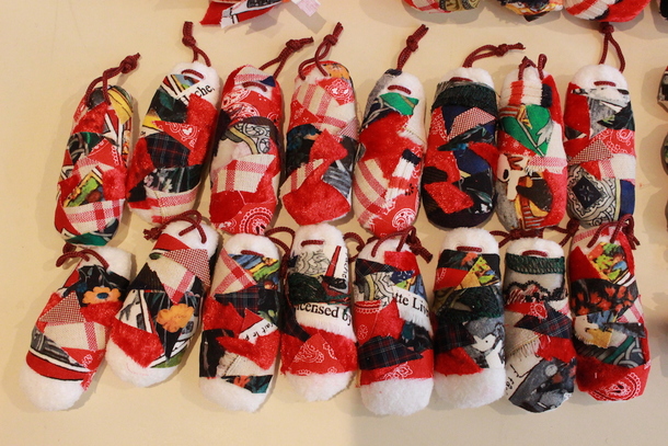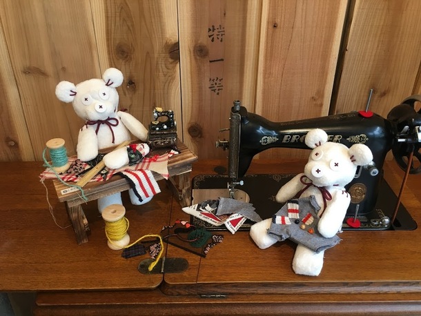 展示用されている「くみぐま」は、パーソナルオーダーのリメイクの過程で生まれた生地の端切れを使い、ノリや両面テープで貼り付けて作りました。