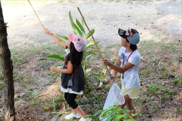 午前は、貝殻細工と泥染めをしました。球美の里はこうした芸術・物作りプログラムも充実しています。貝殻細工は、この三日間海で拾ってきた貝殻で、さんごの風鈴やシーサーのオブジェ、アクセサリーを作って楽しみました!!アクセサリーを作ったお友だちは早速身に着けていましたね^^♪