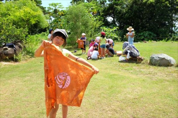 泥染めは、自分の球美の里Tシャツを、球美の里の赤土を使って、楽しく泥んこになりながら泥染めをしました!!自分で考えて輪ゴムを使って、染物をデザインしました!乾いて、着て帰るのが楽しみ~♪