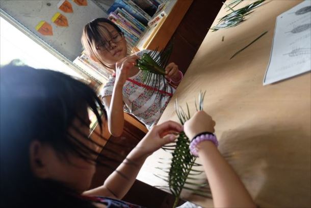 沖縄の草木、アダンの葉で風車とソテツの葉で虫かごの作り方を教わり、竹で作った竹鉄砲で遊んだり竹とんぼをいただいたりと盛りだくさん。