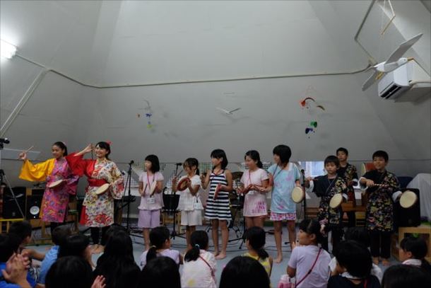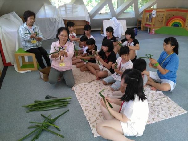 午前は、泥染めやサンゴの風鈴作り、クリップ飛行機作り、折り紙を使った風車、和紙を染めたりなど、さまざまな物作り教室を開きました。子どもたちは目をキラキラさせて、いろいろな物作りに挑戦。