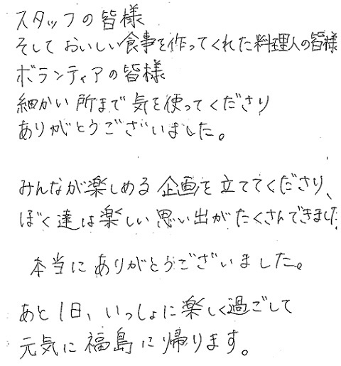 保養中は毎日、朝から晩まで寝る間も惜しんで子どもたちのお世話をしてくださったボランティアのみなさんからも一言ずついただきました。