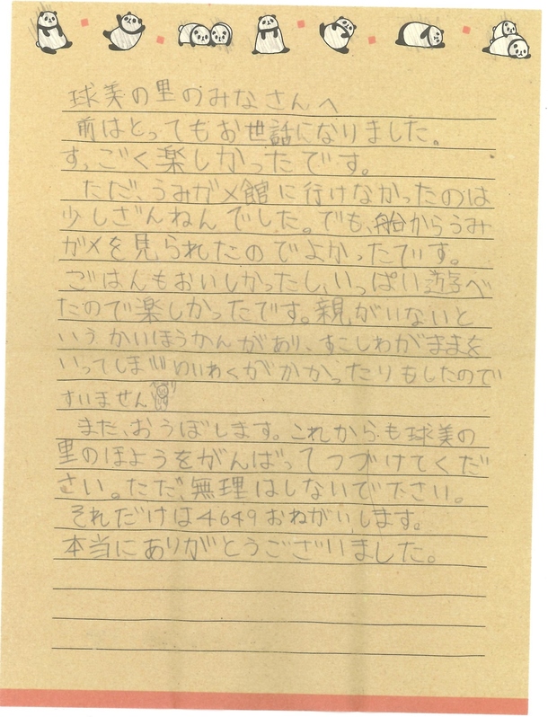お子さんのほうはウミガメを見られたこと、ご飯が美味しかったこと、開放的になれたことなどが「すっごく楽しかった」そうです。「またおうぼします」と言ってくれたうえに、スタッフへは「これからも球美の里のほようを続けてください。でも無理はしないでください。それだけは4649おねがいします」とのねぎらいと気遣いの優しい言葉も。ありがとう~。