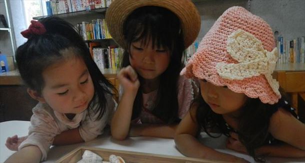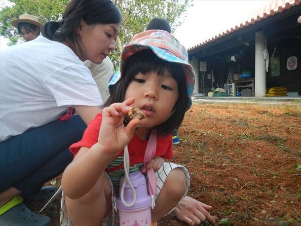 そしてそのあと「ホタル館」で生物観察。この施設でも、子どもたちは実際に久米島の植物や小動物に触ったり、音を聴いたり、匂いを嗅いだりて、幼児期には特に重要な「五感で感じること」をたくさん体験していきます。