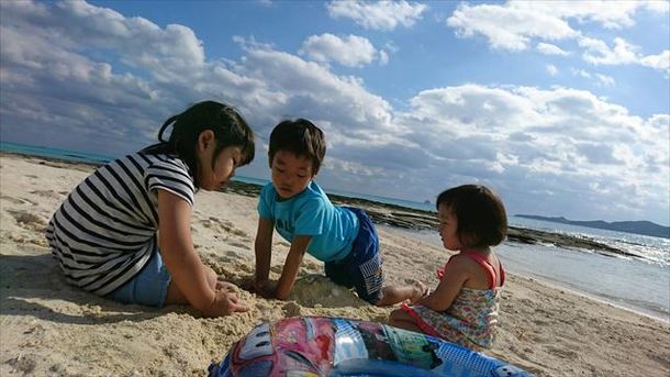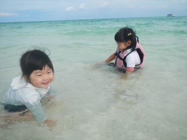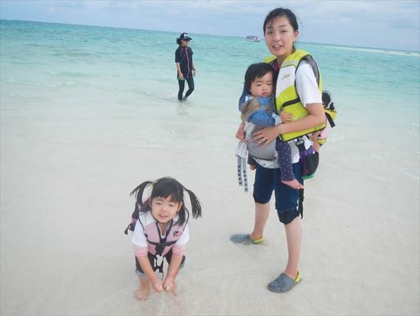 午前、その美しさは東洋一と言われる「ハテの浜」へ。震災から5年半以上が経ちましたが、福島ではいまだに海に入ったことがない子どもたちがたくさんいて、球美の里の保養中に久米島で海に入って海水浴デビューする子も少なくありません。