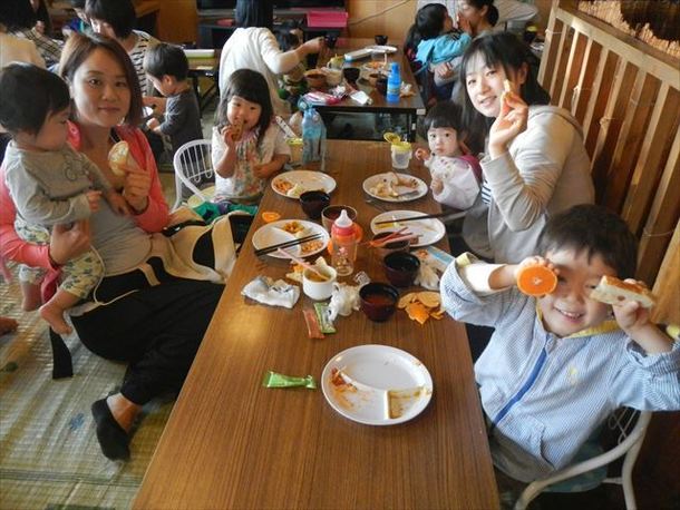 午後は「ママカフェ」をしました。ママカフェとは、お母さんたちがお茶を飲みながら同じ境遇のお母さん同士、悩みごとを話しあったり、情報交換をしたりするための場所です。小さなウェイトレスさんがみんなの注文を聞いて、おやつと飲み物を運びました。お母さんたちは見晴らしのいいカフェスペースでゆっくりおしゃべりを楽しみました。