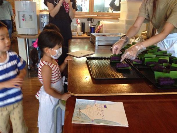 午後はママカフェ。おやつは「紅いもようかん」です。