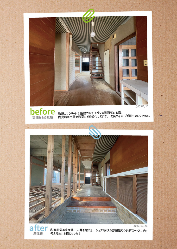 現在は解体がほぼ終わり、シェアハウスとしての部屋割りやスペースの活用方法を考えながら作る作業に入っています。