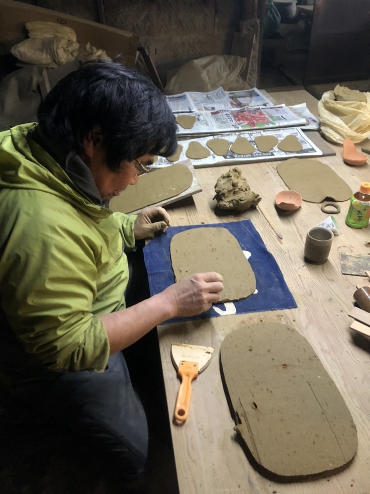 「タタラ」をつくるのですが、原土を混ぜていいるので、ぷつぷつと穴が空いたり、石が混ざっていたり。