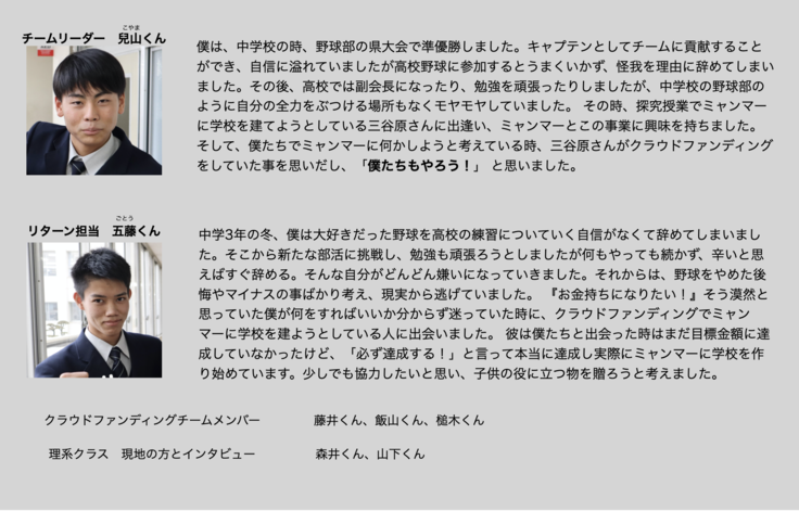 ありのままをさらけ出し、この挑戦する姿を見てもらうことで、僕たちのように挫折を経験した高校生やこの挑戦を知ってくれた誰かが再び新たな挑戦したり、自信を取り戻してくれたらと願っています。