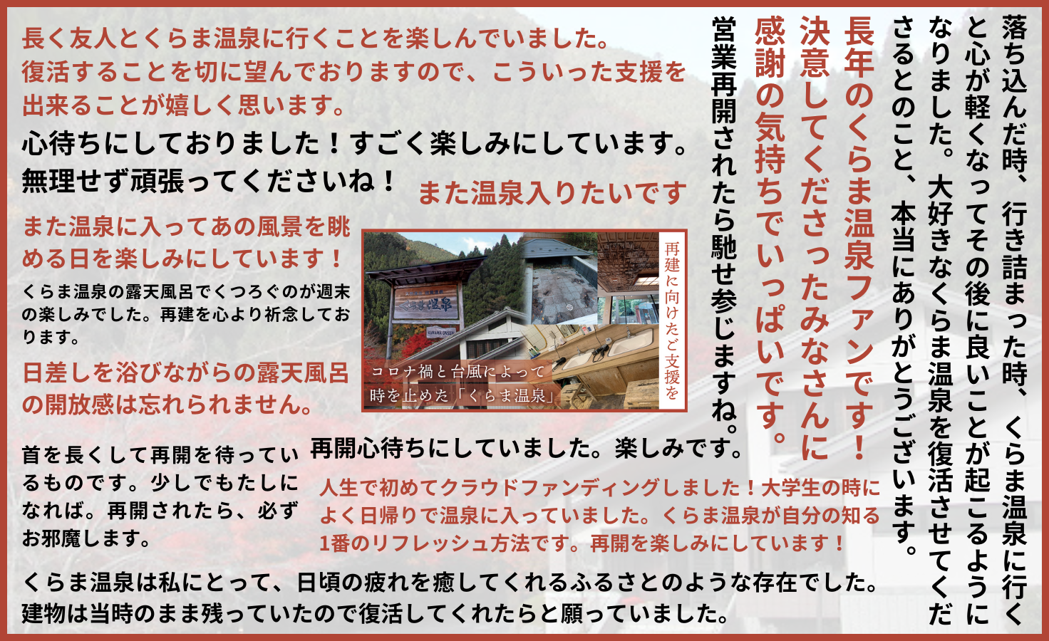 今日まで挑戦を続けて来られたのは、ひとえに「くらま温泉」の再会を願う皆さんからのあたたかいご支援と応援コメントに支えられてきたからです。改めてこれまでご支援をいただいた皆さん、本当にありがとうございます。