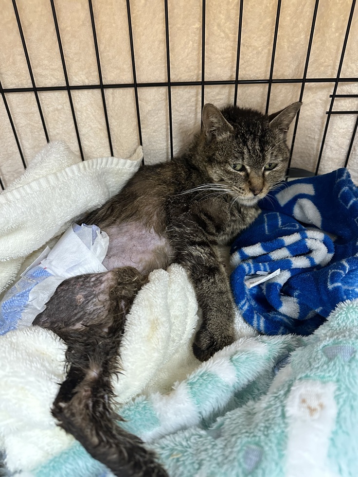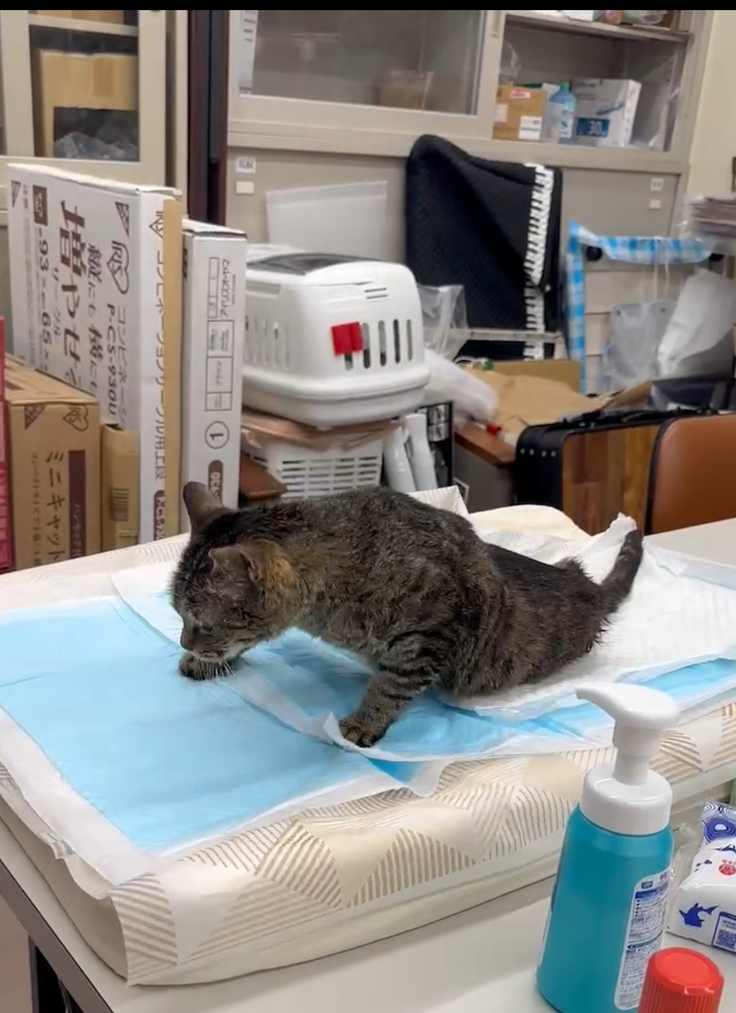 交通事故で脊髄を損傷し、下半身麻痺があるキジトラ成猫のミラクルちゃん(推定3歳)。どうやら事故にあったときは妊娠していたようです。事故の衝撃で流産し、子宮からの出血が止まらない状態でした。骨折と重度の貧血で状態は不安定でしたが、何とか持ち直し、止血を兼ねた子宮摘出の手術をすることができました。何度か入退院を繰り返し、保健所に戻り自力で食べたりもしていたのですが、トイレに行くことはできません。糞尿は垂れ流し、悪臭をはなっていました。餌も水も口元に持って行って食べさせるのがやっと、さらに恐怖からか威嚇もありました。このままの状態では期限までに里親が決まらず殺処分の可能性もでてきます。